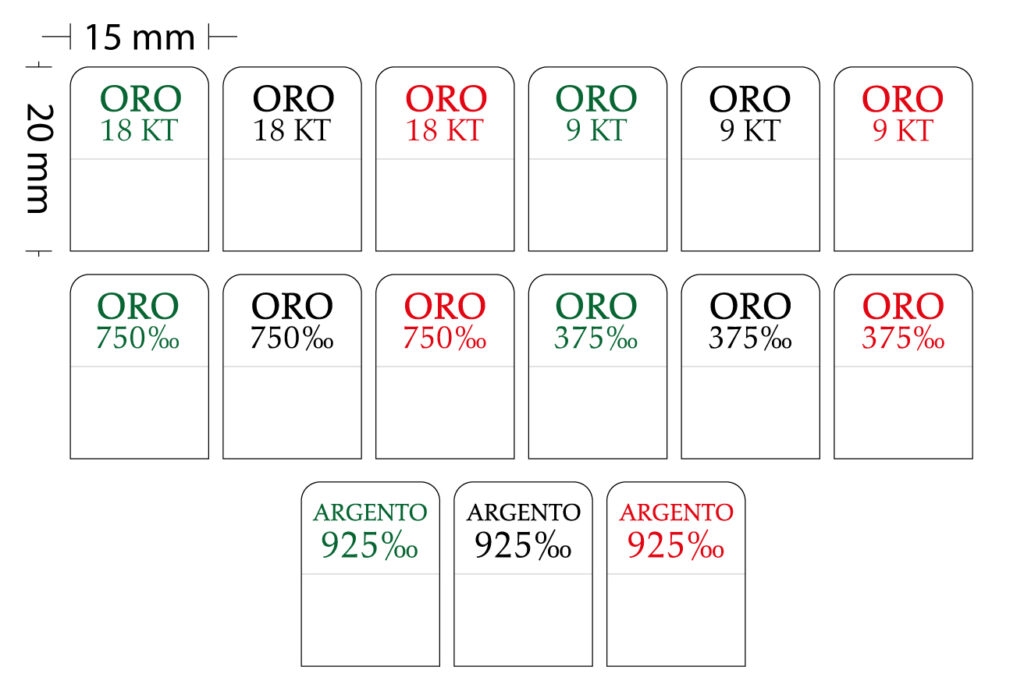 | Dicitura | ORO 9KT, ORO 18KT, ORO 375‰, ORO 750‰, ARGENTO 925‰ |