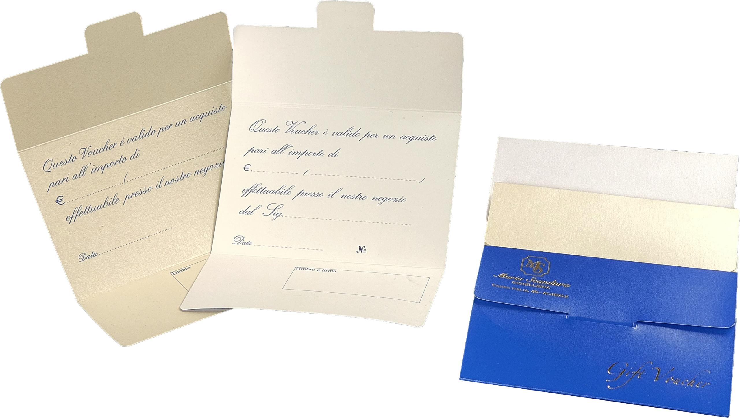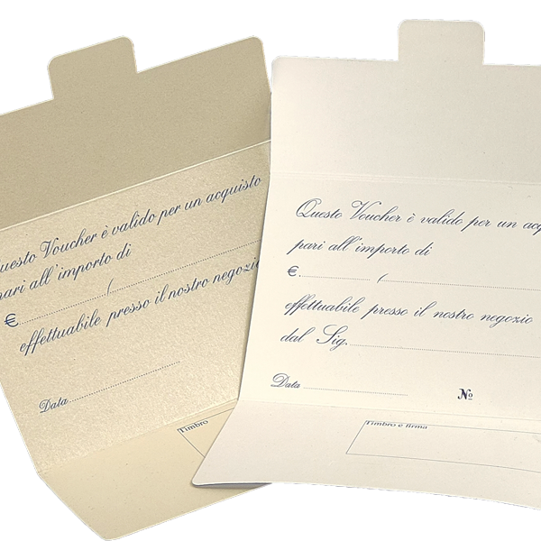 L’apice dell’eleganza per i tuoi Gift Voucher. Un set esclusivo composto da una custodia esterna personalizzata con stampa a caldo, foglio interno a scelta con stampa digitale e logo a caldo come la custodia e rifinitura con un prezioso nastro in raso da 13 mm a scelta. Formato 10×15 cm (chiuso). Trasforma un semplice buono acquisto in un regalo indimenticabile. Disponibili anche solo i fogli interni di ricambio con la grafica da te scelta e il logo stampato a caldo cliccando qui CER AL R.