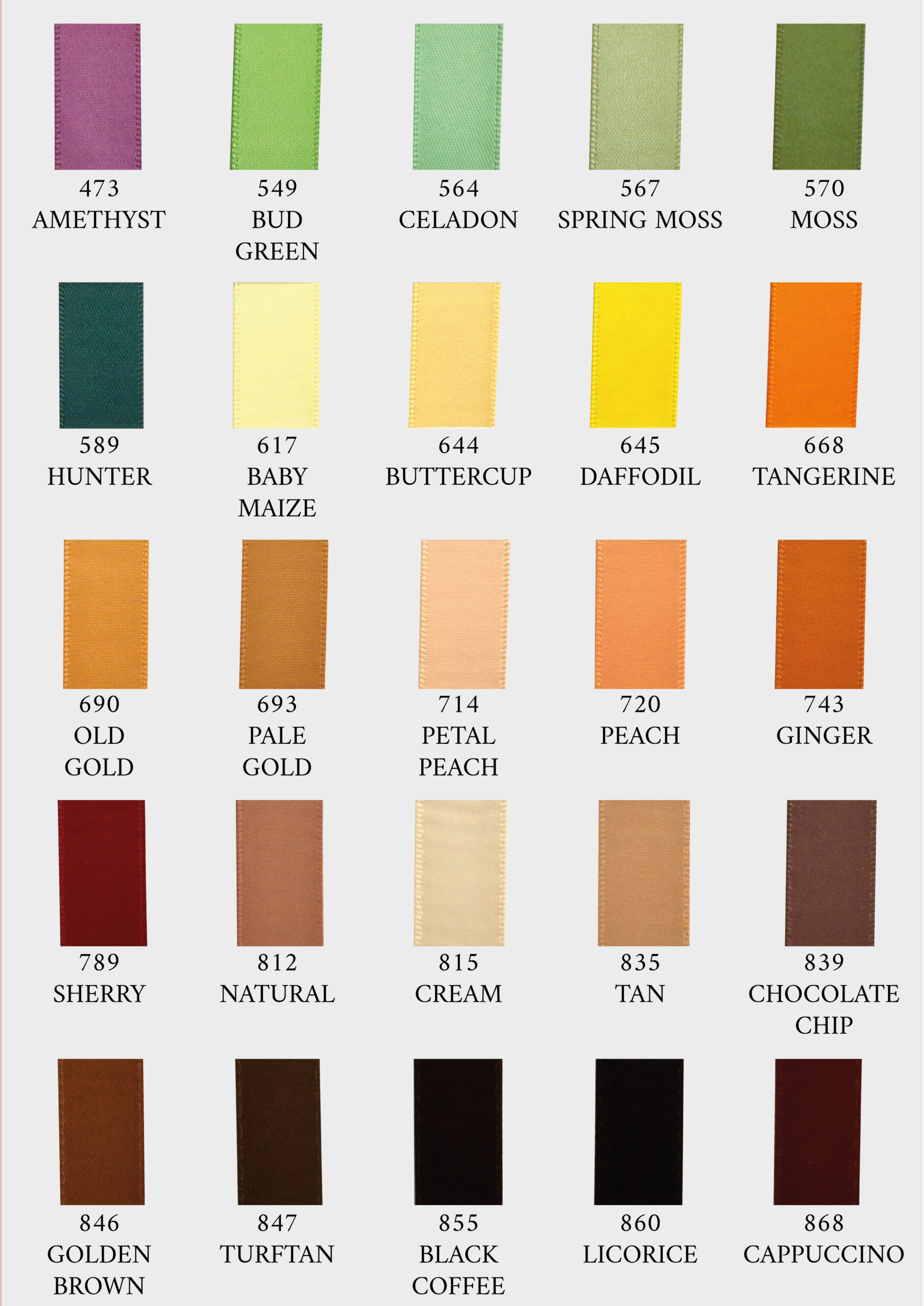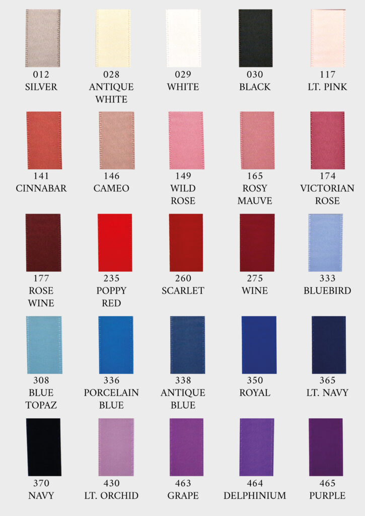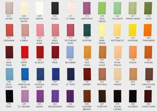 | Colori Nastro | 012 Silver, 028 Antique White, 029 White, 030 Black, 117 Lt. Pink, 141 Cinnabon, 146 Cameo, 149 Wild Rose, 165 Rosy Mauve, 174 Victorian Rose, 177 Rose Wine, 235 Poppy Red, 260 Scarlet, 275 wine, 308 Blue Topaz, 333 Bluebird, 336 Porcelain Blue, 338 Antique Blue, 350 Royal, 365 Lt. Navy, 370 Navy, 430 Lt. Orchid, 463 Grape, 464 Delphinium, 465 Purple, 473 Amethyst, 549 Bud Green, 564 Celadon, 567 Spring Moss, 570 Moss, 589 Hunter, 617 Baby Maize, 644 Buttercup, 645 Daffodil, 668 Tangerine, 690 Old Gold, 693 Pale Gold, 714 Petal Peach, 720 Peach, 743 Ginger, 789 Sherry, 812 natural, 815 Cream, 835 Tan, 839 Chocolate Chip, 846 Golden Brown, 847 Turftan, 855 Black Coffee, 860 Licorice, 868 Cappuccino |