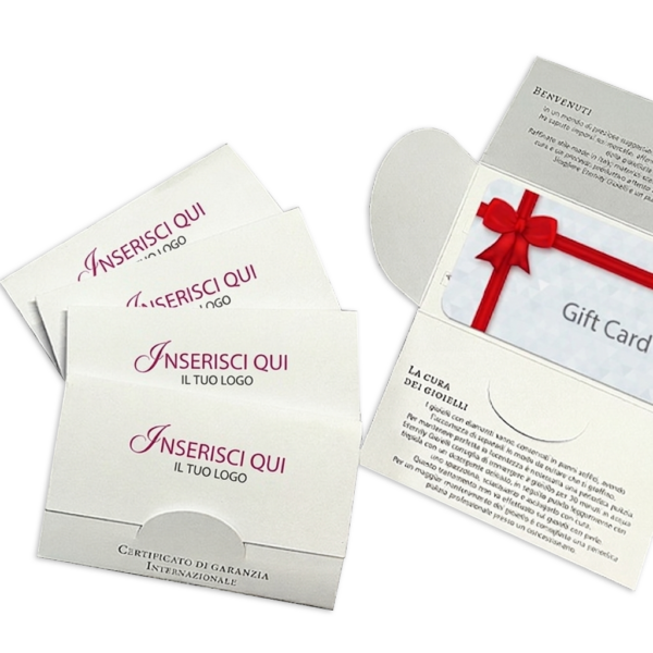 La soluzione professionale per chi offre Gift Card in formato tessera. Un elegante supporto in cartoncino bianco con diciture interne pre-stampate, progettato per alloggiare in sicurezza la card grazie a una fustellatura interna dedicata. Realizzato con stampa tipografica nitida, è interamente personalizzabile per riflettere l’identità del tuo brand.