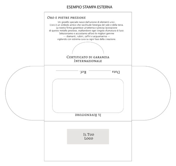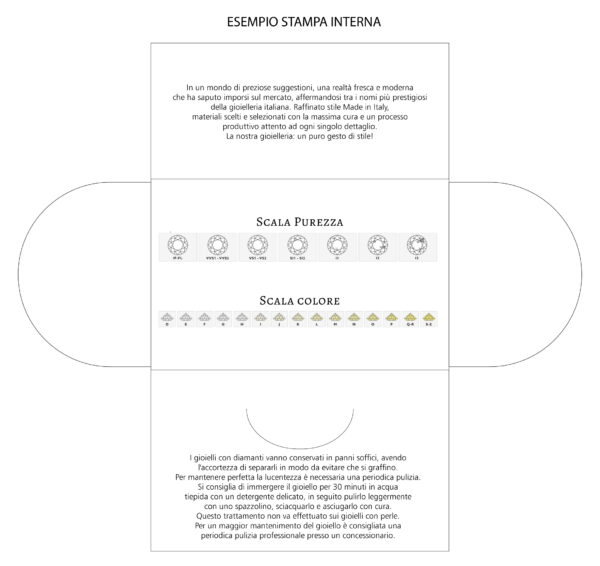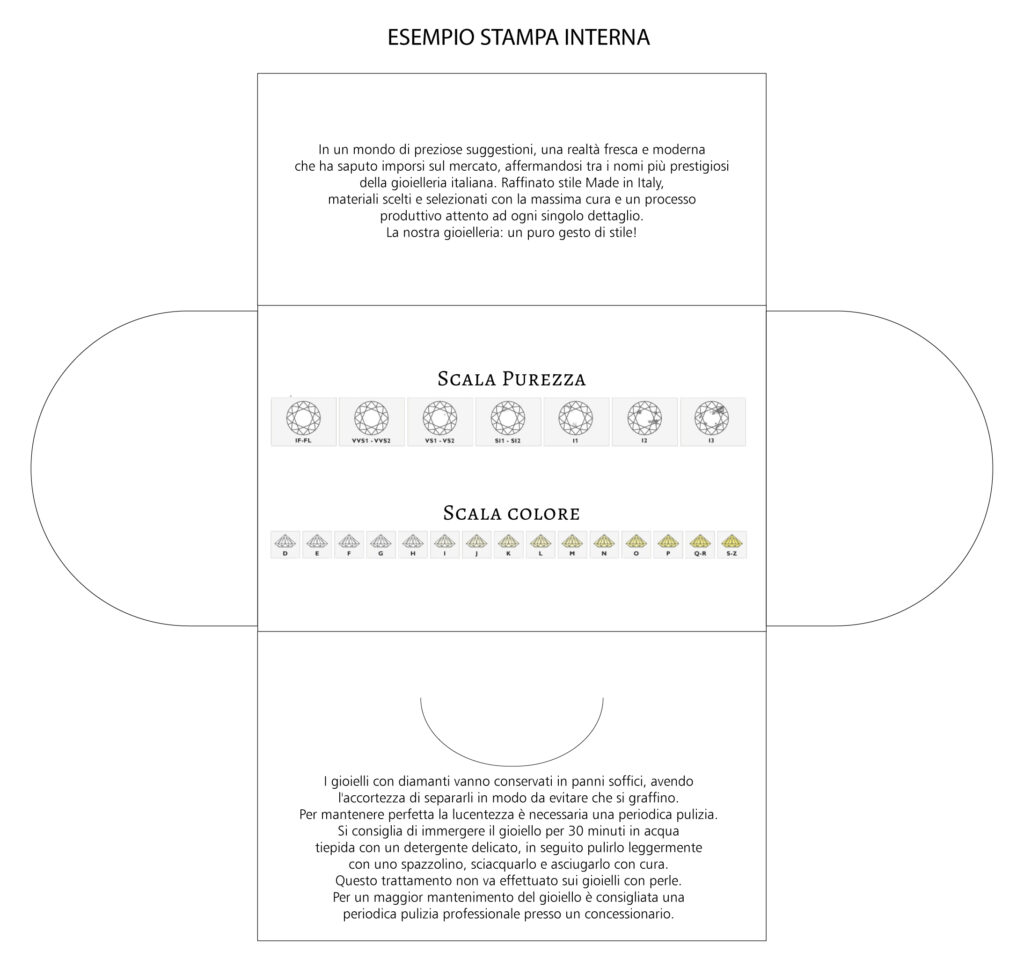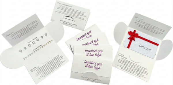 L’Art. 2054T è il supporto ideale per trasformare una semplice card in un’esperienza regalo di prestigio. Realizzato in cartoncino bianco di alta qualità, questo certificato funge sia da garanzia che da custodia, presentando al suo interno informazioni utili sulla cura del gioiello e scale di purezza/colore, aggiungendo valore informativo all’acquisto.