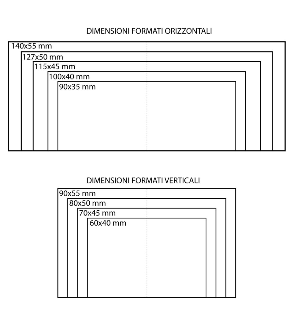 - Dimensioni a scelta: Puoi richiederla in 9 misure differenti standard (vedi tabella sotto) o personalizzata nel range che va da un minimo di 9 x 3,5 cm fino a un massimo di 14 x 5,5 cm (misure riferite alla garanzia aperta).