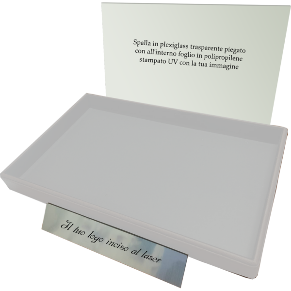 Spalla Portafoto: Una spalla in plexiglass trasparente (3+3 mm) permette di inserire un’immagine personalizzata o il proprio brand (dim. 21.5×15 cm).
